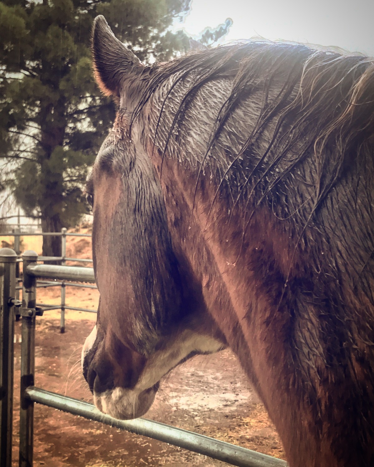 The lightning spat, the thunder growled. Dogs scurried every which way, searching for shelter under anything they could find. Most of the horses cowered into the darkest corners of their stalls, seeking safety, but not him. He was unswerving, storm tested, braver than all. He was his own security. His russet head hung over the stall door, his golden eyes quiet, considerate. The rain dripped down from the cracked gutter, soaking his floppy ears and face. But he didn’t seem to mind. I had to wonder why. Could he hear my thoughts? Was he done, was this the end? Would he ever be the same again? Was that what kept him still? I realized my own face was just as drenched-but not from rain. From the burning, salty tears staining my cheeks, sneaking freely from cracked tear ducts.